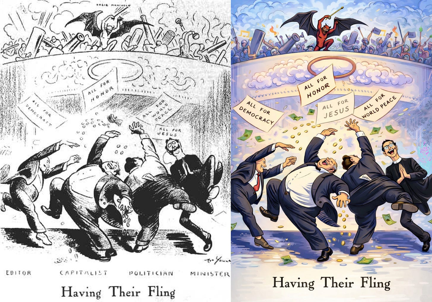 The purest Tyrumpists are among the most brainwashed, uncaring, and careless people in the world. And many are very, very rich. Some think they see the Divine Light. Some are Liars of Empire in an Empire of Lies. Insanity abounds where so much foolish and fraudulent and deadly make-believe is both fostered and allowed to fester. This make-believe often comes with as much power as reality — or more — as much appeal and force as sanity — or more. Better the Devil you think you know by your own good day than the Devil you wildly imagine in those nasty Others’ wicked, wicked nights.